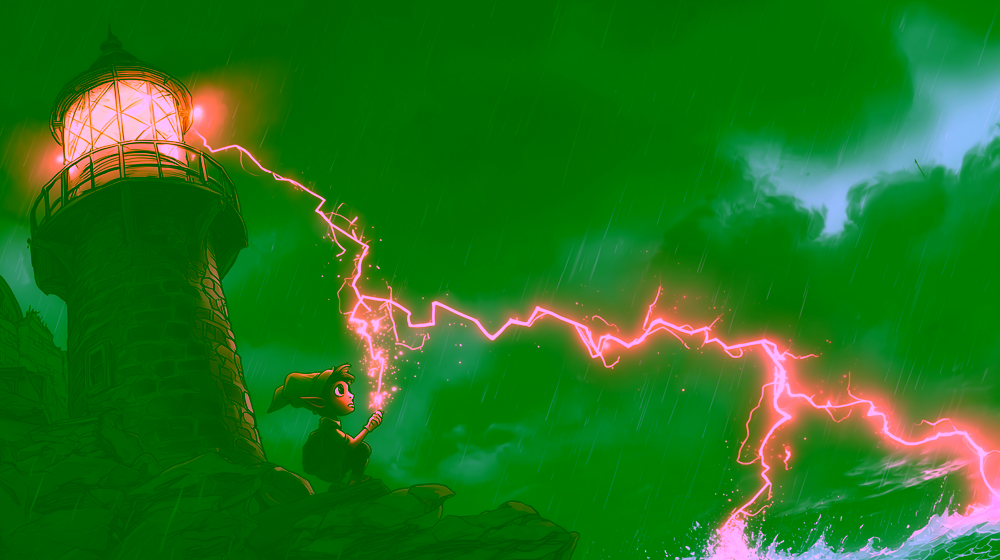 Titilar salva un barco en plena tormenta creando chispas mágicas cuando el faro se apaga. Heroísmo luminoso en la noche más oscura del mar.