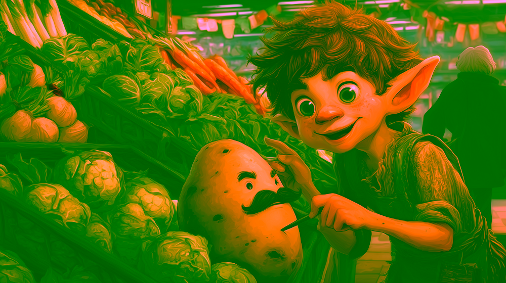 Patato revoluciona el súper con bigotes en patatas y lacitos en brócolis. Travesuras épicas que convierten la compra en una aventura divertida.